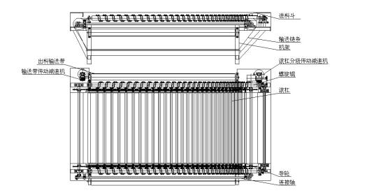 機器由輸送鏈條、滾杠、機架、螺旋輥、導輪、傳動減速機等部分組成。該機由提升機上料進入該機,通過兩滾杠之間的間距不段變化來分級機的,分級時物料通過滾杠的輸送向前運動,當物料運輸到兩滾杠之間的間距大於物料的外形尺寸時,物料就會自動掉入輸出通道的皮帶上被輸出,從而達到分級目的。本設備是一台從小到櫻桃、藍梅,大到菠蘿、柚子都可以分級的新型分級設備。而且在一定的分級範圍內分級尺寸與分級級別可無級調整。