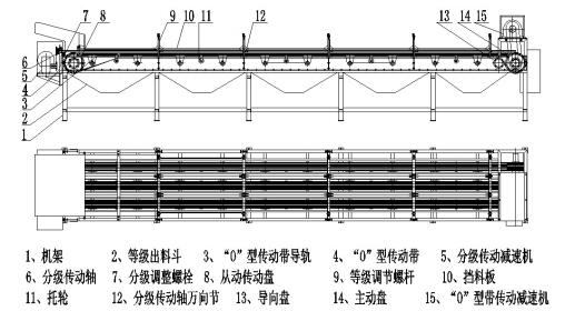 該分級機由機架、等級出料鬥、“O”型傳動帶導軌、“O”型傳動帶、分級傳動減速機、分級傳動軸、從動傳動盤、擋料板、托輪、分級傳動軸萬向節、導向盤、主動盤、“O”型帶傳動減速機等部分組成。該機工作原理是利用“O”型傳動帶與分級傳動軸之間的間隙對物料進行分級,物料離進料口越遠,“O”型傳動帶與分級傳動軸之間的間隙越大。同時由於分級傳動軸向“O”型傳動帶外一側轉動,使得水果360度旋轉,從而避免了因水果的不規則而導致的分級效果不佳的現象。