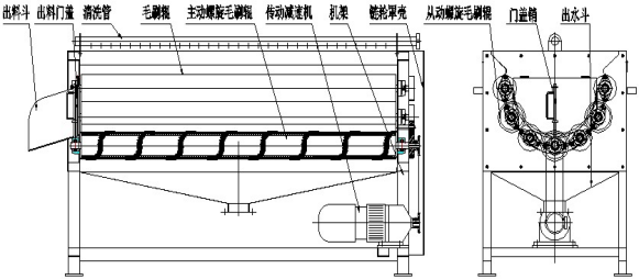 該毛刷去皮清洗機主要由機架、傳動減速機、鏈輪罩殼、噴淋管、毛刷輥、出水鬥、出料門蓋、出料鬥、門蓋插銷等部件組成。