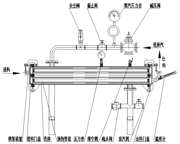 3、打開蒸汽閥進蒸汽,調節減壓閥,壓力控製在0.1MPa以內後,緩緩打開截止閥、放汽閥,待放汽閥出現冒蒸汽時,關閉放汽閥。開啟進料泵輸送物料,同時加大蒸汽壓力,視溫度計示值變化,因進料溫度不同,實際操作時,應掌握蒸汽壓力與出料溫度,速度之間的關係。當溫度達到規定要求時即可正常出料。