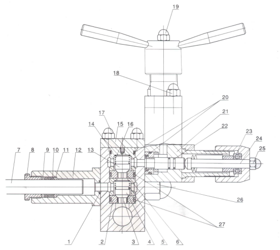 1.壓力表組件  2.表座密封墊  3.表座壓蓋  4.壓蓋  5.圓錐柱 6.壓蓋密封墊  7.緊鎖螺帽  8.調節螺帽  9.帶孔緊鎖螺帽    10.錐閥芯   11.上錐閥座   12.限位套   13. 下錐閥座     14.調整墊片  15.螺塞   16.O型橡膠密封圈    17.泵體      18.柱塞密封套  19.泵體平麵密封圈  20.緊定螺釘  21.壓環    22.柱塞密封圈 (V型或方型) 23.隔離片  24.座環  25.柱塞