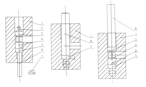 1.泵體     2.椎閥芯   3.上椎閥座   4.限位套   5.下椎閥座    6.敲棒      7.螺塞     8.敲棒(附件3)