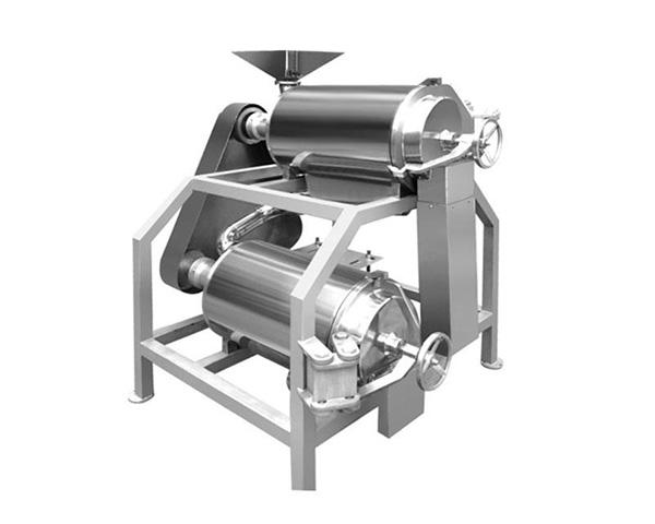 電機由皮帶驅動,使安裝在花鍵上的刮刀高速旋轉。當破碎的水果通過進料口進入機器時,收料盤將物料均勻地卸到刮板和篩網上。由於刮刀的旋轉作用和導角的存在,物料沿圓筒移動到出口端,運動軌跡呈螺旋狀,物料在刮板和篩筒之間的移動過程中受到離心力的擠壓,果汁、肉(已成漿)經篩孔送至下道工序(雙打、三打聯動重複上述工序)皮、籽等,然後從渣鬥排出,達到自動分離的目的。