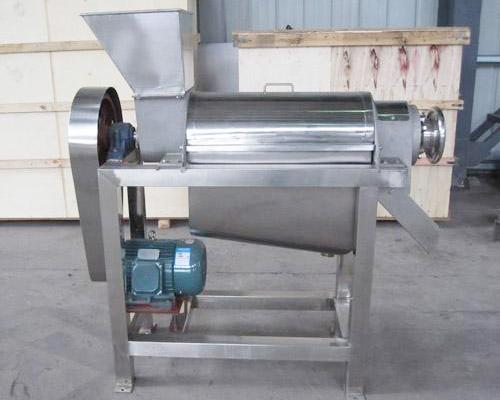 其主要工作原理是:打開電源,將物料倒進進料口,水果從料鬥到壓輥中間,壓輥向相反方向旋轉,壓輥表麵有衝頭。根據刀尖的摩擦力,將水果從壓輥的中間間隙壓入較低的間隙,在壓輥和切割刀的作用下將水果切成兩半。在壓榨輥旋轉的驅動下,兩個壓榨輥與壓榨輥下的電弧篩之間的間隙逐漸減小,在壓榨輥的作用下,水果被擠壓,果汁通過篩孔從收汁槽中擠出,果汁從出汁口排出。切割刀間隙調節裝置可調節弧篩上下,以控製水果的出汁量。弧篩兩側有切割刀(可上下調節切割刀以控製外果皮和剩餘果肉的比例),剩餘的果肉可分為外皮和水果的殘漿,剩餘的果肉可以用濾網排出到渣螺旋輸送機中,壓輥頂端的外皮可以被刮刀刮掉,排出到皮螺旋輸送機中。